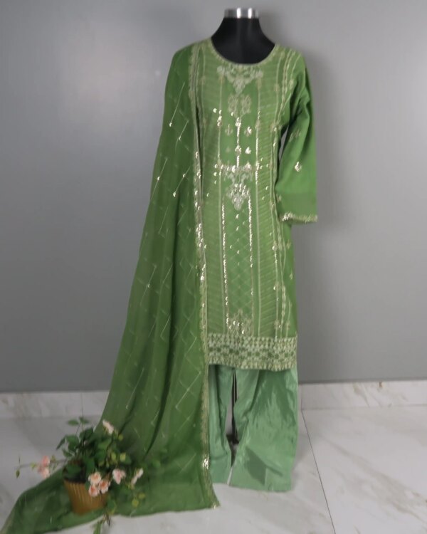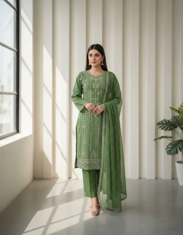 The dupatta is crafted from matching soft georgette and complements the outfit with intricate embroidery and fine detailing, adding an extra layer of elegance. Completing the set is a comfortable santoon pant, offering ease and a polished finish.